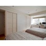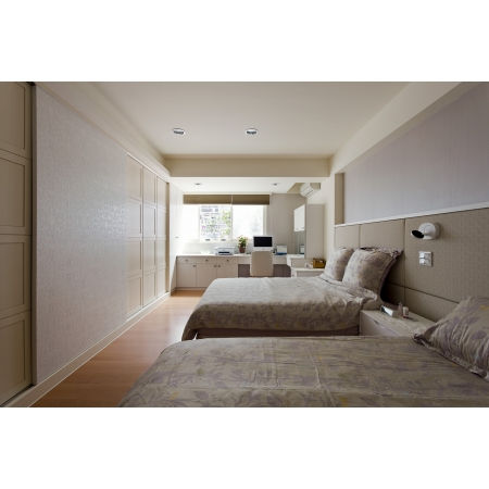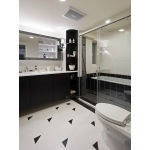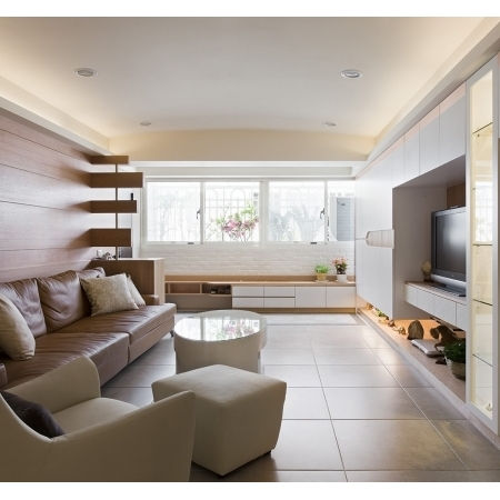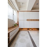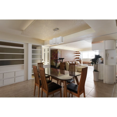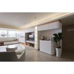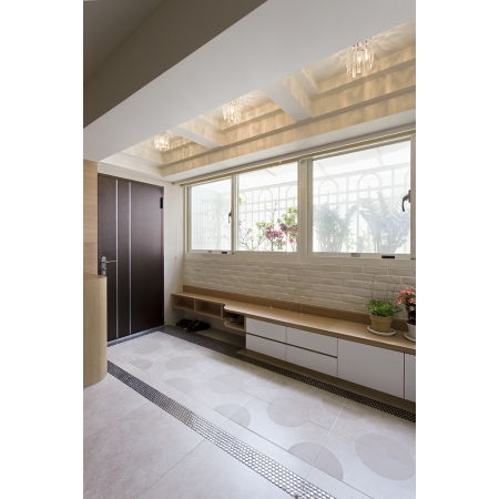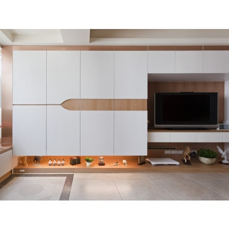 一進門的玄關區緊臨面外觀景窗,上方等比均分的立體天花造型穿插水晶燈影,釋放優雅的迎賓氣氛,窗下靠牆準備了一長列簡潔的收納櫃兼穿鞋椅,方便人們的進出,帶狀地面也以特殊磚搭配馬賽克滾邊,低調分野全數鋪設霧面石英磚的客、餐廳區。由正對門口的牆面向右伸展的硬體創意,除了電視主牆機能,整體更是一座外型精美的多功能收納櫃,一次涵蓋展示、情境、視聽、收納、立面美感、預留鋼琴區等多重意義,刻意拉長的面寬,同時也能修飾後方房間入口以提升隱私性。