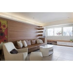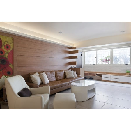 理想的起居空間,乾淨俐落的空間層次與機能分配,必然佔據決定性的位置。好比客廳沙發背牆以素雅木色為主,大面積使用健康無毒的木料推油處理,豐富的自然感呼應大地色系傢具,牆面轉折處更以油畫質感、大圖輸出的寫意花卉畫龍點睛,熱力十足的色彩組合展現豐饒的生命力,也帶出隨心自在的人文氣息。