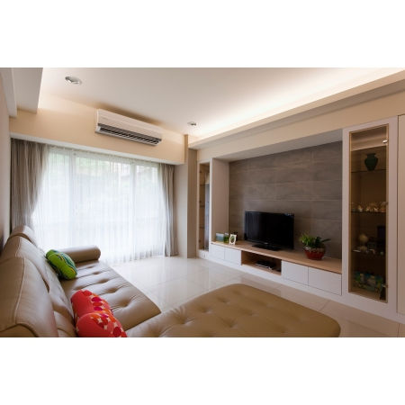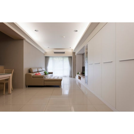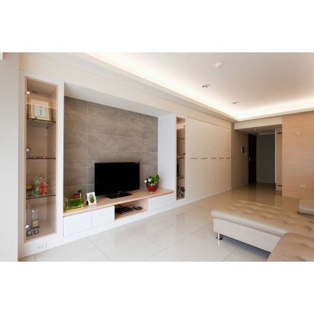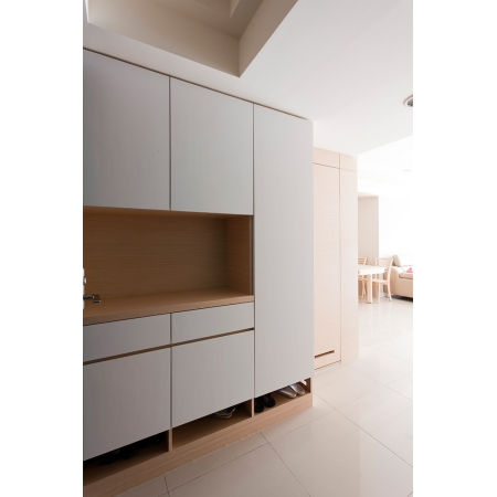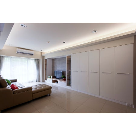 一進門正面即是收納高櫃,櫃側上下特地保留通風口,周邊牆面則刷上雅緻色彩,醞釀清新印象。由玄關旁牆面向客廳延伸的白色高櫃,除了提供公共區域充足的收納,更巧妙將動線引進明亮客廳,廳內簡潔的天花板層次,搭配柔和邊緣照明爭取最佳高度,電視主牆則以中央倣版岩磚為視覺主題,表現粗獷自然的質感同時易於清理維護,兩側對稱精品櫃則強化客廳中軸,營造更為沈穩、安定的空間感。