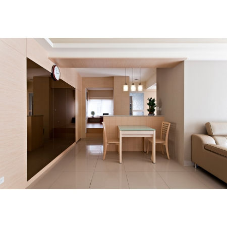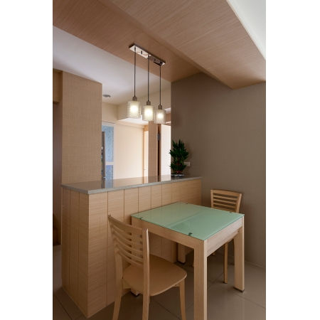 優美的餐廳善用動線往返的區間來規劃,賦予有限地坪更多彈性。餐桌後方大面茶鏡端景牆讓視覺有了深邃延展,並融合餐桌旁視線可自由穿透的餐檯為軸心,將原本狹長的帶狀廚房打開來,成為公共空間的一部份,大大豐富生活情趣。