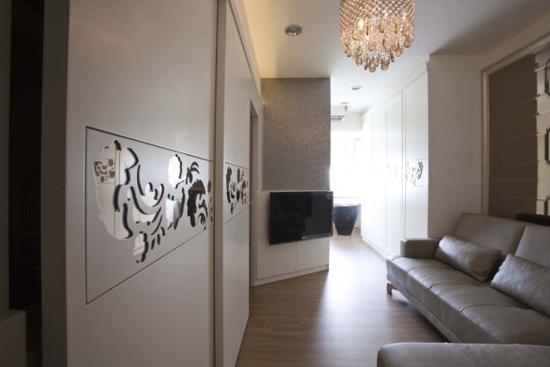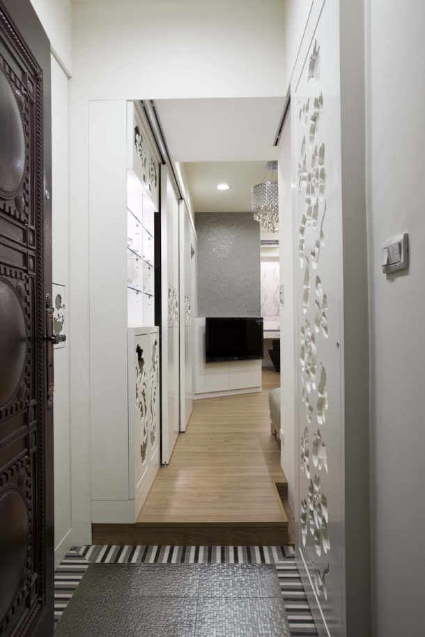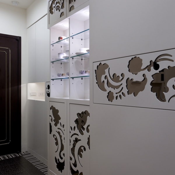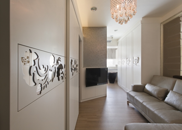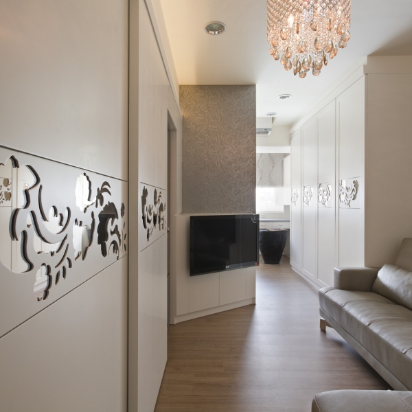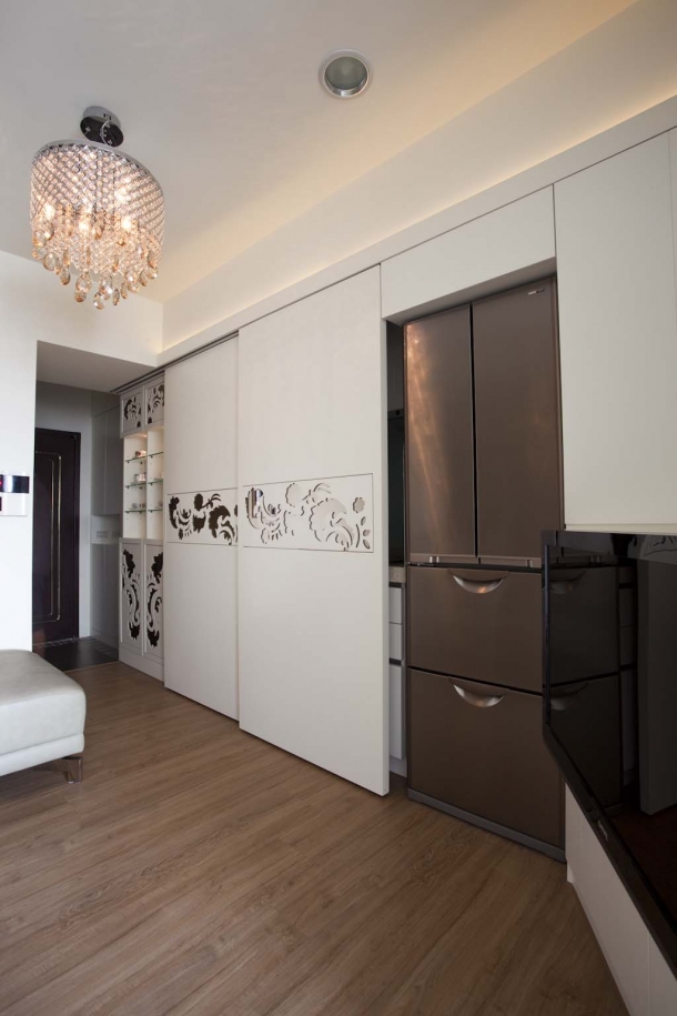 包括廚房料理區的造型拉門、精品展示間收納櫃以及玄關鞋櫃,整個連續的機能造型中,我們運用白色與雕花圖騰兩種元素,配合柔和的重點燈光加以整合。廚房工作區牆面貼覆烤漆玻璃,質地清涼又好清理,檯面下方還嵌入洗脫烘衣機設備,生活機能面面俱到。