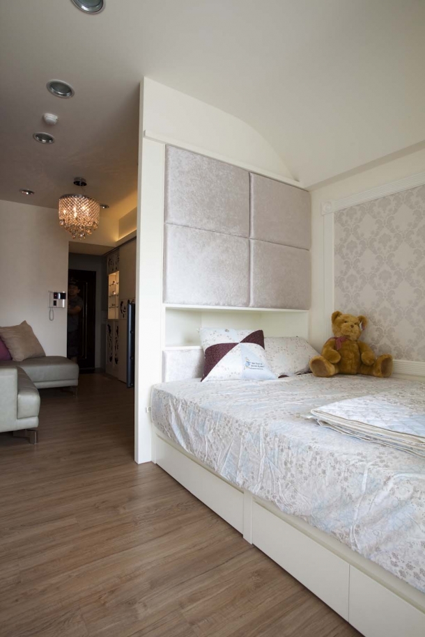 睡眠區床畔牆面以包框的壁紙圖騰修飾,上方更以圓弧的天花造型化解橫樑的壓迫,床頭以淡紫色絲絨繃出另一個柔軟造型的收納空間,中段同時也利用客廳電視牆斜切後的深度規劃放置小物空間,情境既舒適又溫柔。