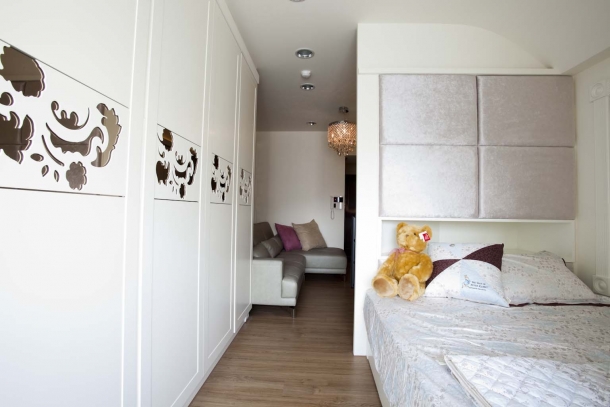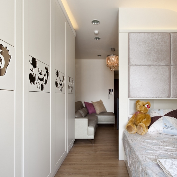 睡眠區利用屋子靠窗的後半段來規劃,明亮的窗前安排閱讀加梳妝區,右側靠牆是衣物高櫃,腰間點綴鑲了茶鏡的雕刻飾板,增加硬體的精緻美感。