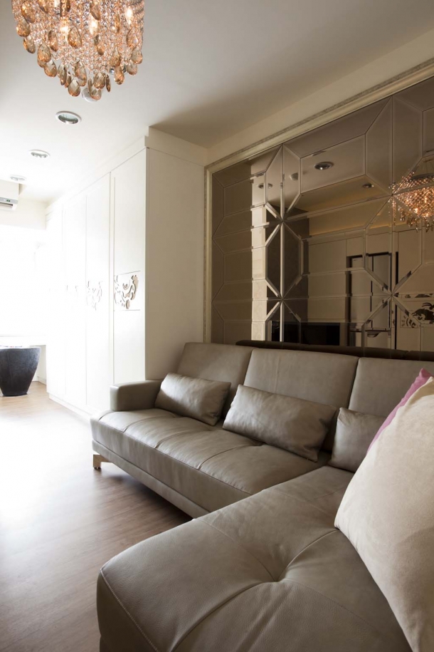 客廳沙發背牆以加了復古金色藝術畫框的茶鏡來修飾,透過精緻細膩的導角拼接技術,創造豐富的繽紛光影,並與天花板中央吊掛的水晶燈飾相互輝映,營造放大空間的視覺效果。