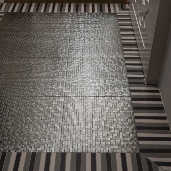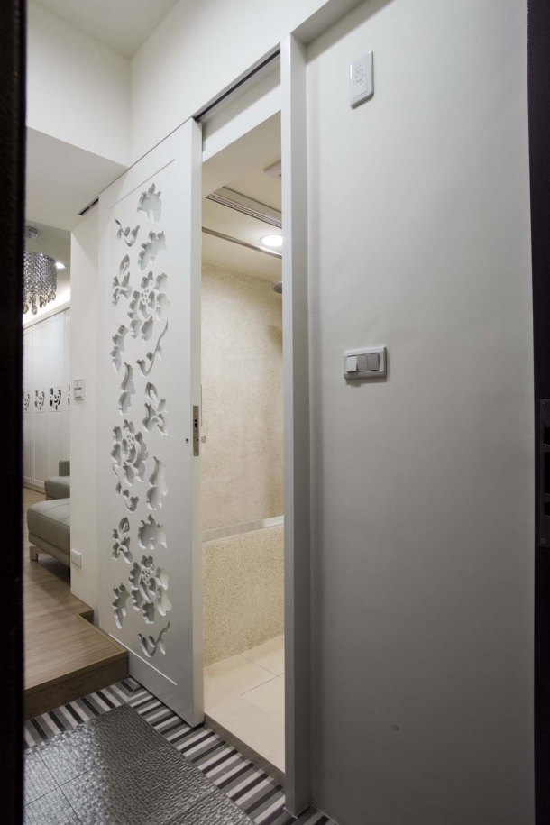 進門玄關區地面使用活潑的花磚與架高的木質地板區隔,標示空間內外也兼具集塵效果,畫面右側白色的立體雕花門片是通往浴室的入口,精緻的施作將細節的美詮釋得淋漓盡致。