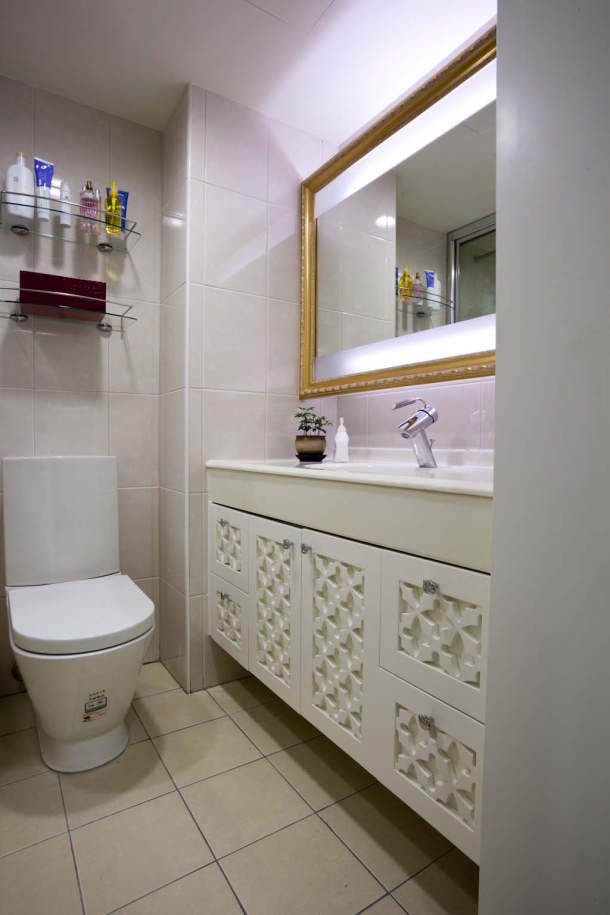 迷你浴室內卻擁有寬裕的金色框鏡與洗手檯面,鏡面上下局部噴砂處理,營造後方間接光源的情調美感,檯面下方搭配門片精工雕花的浴櫃設計,出色的生活品味表露無遺。