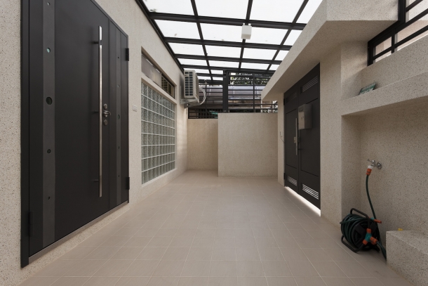 30年老屋從外觀開始改造,門面與庭院均塗抹磨石子,不僅容易維護,樸實質感也兼顧住宅品味與低調生活訴求。接著,為了確保隱私又保有良好照明,於是庭院裝設採光罩,不必擔心風吹雨淋,當擺放桌椅後,居家更多了一處能放鬆的愜意角落。