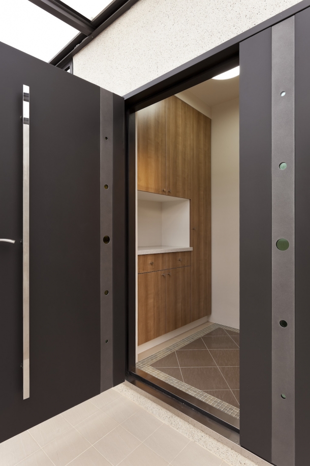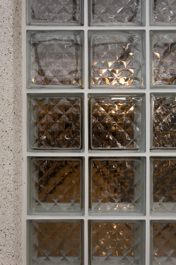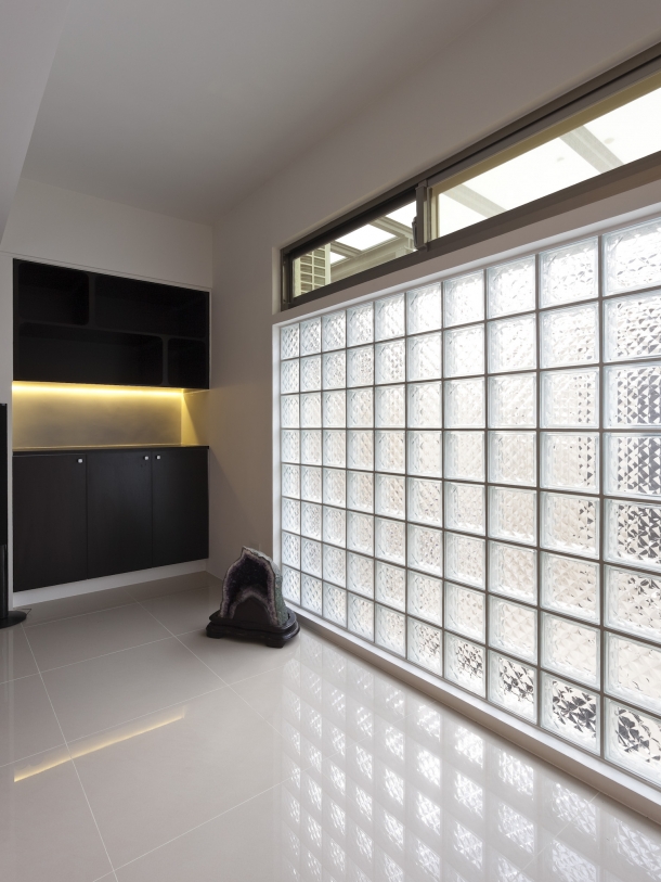 客廳與庭院之間配置一整面玻璃磚,取代了落地門窗,除了藉由其透光不透影的特質,讓自然光線依舊能夠引入客廳,增添明亮舒適性,還希望能夠維持生活隱私,加上上側安置橫條氣窗,確保通風之際,也能達到防盜目的。
