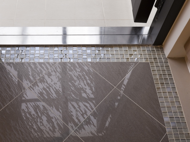 玄關地板透過磁磚斜線切割,外圍再裝飾馬賽克,營造出精緻迎賓氣氛,並與連貫開放的客餐廳做出視覺區隔。