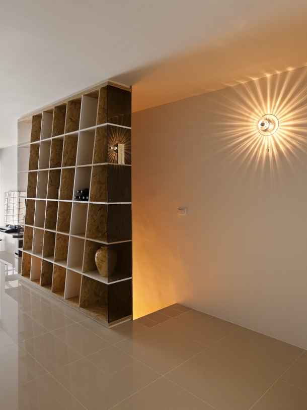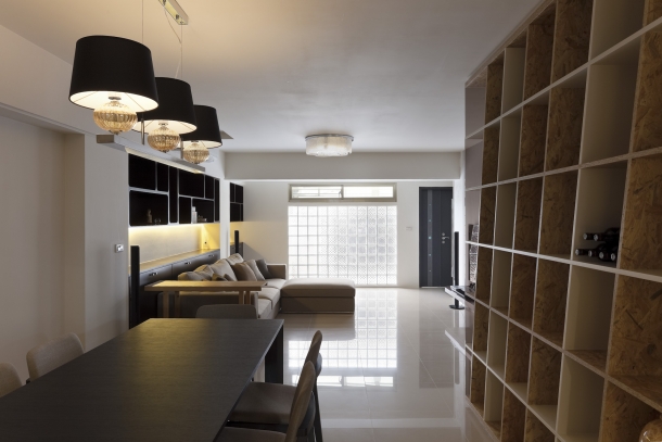 因為整面玻璃磚牆引入通亮採光,客餐廳更顯開敞舒適,然後沙發背牆與餐廳都設計開架式櫃體,光影襯托下,進一步賦予空間層次景深。 ![]() | ![]() | ![]() |