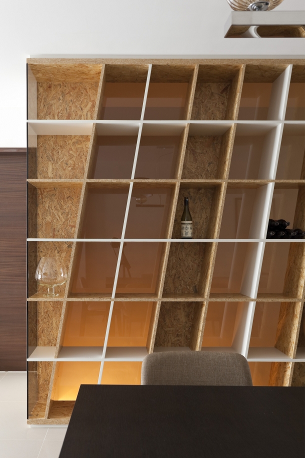 面向餐廳的書櫃極具設計巧思,不僅透過密集板材、玻璃等異材質組構,背板還是透明壓克力板,讓視野與燈光可以穿透,因此當後方地下室的燈光開啟,即營造穿透出光感情境,又突顯出書櫃傾斜層板的趣味性。