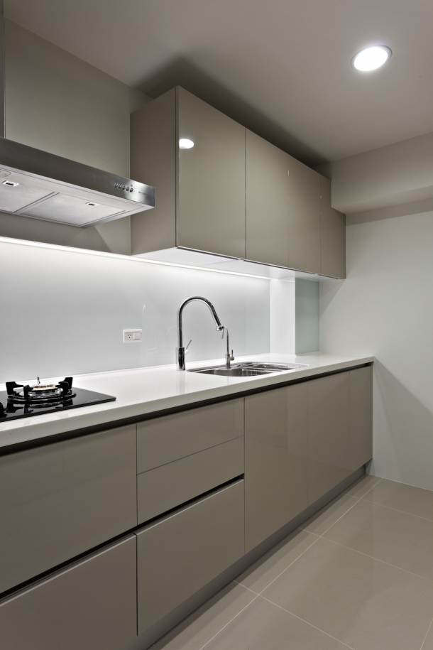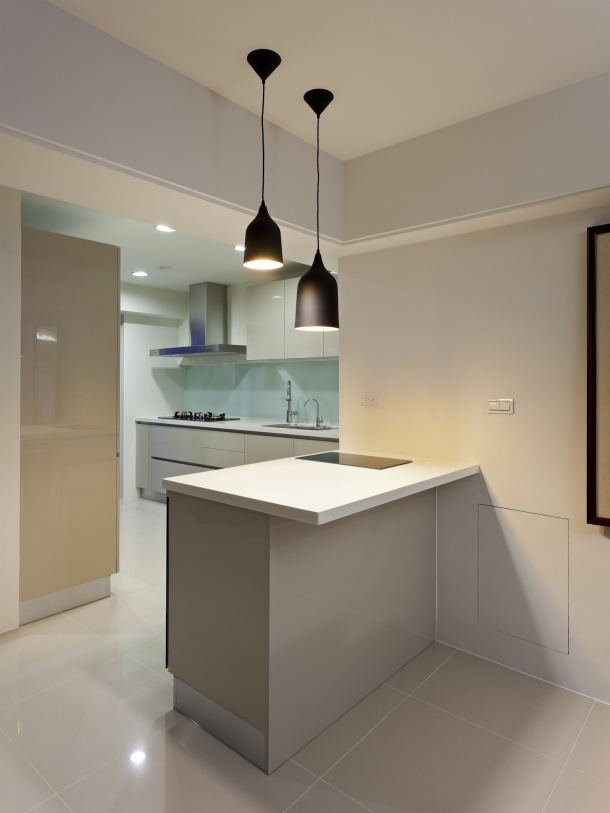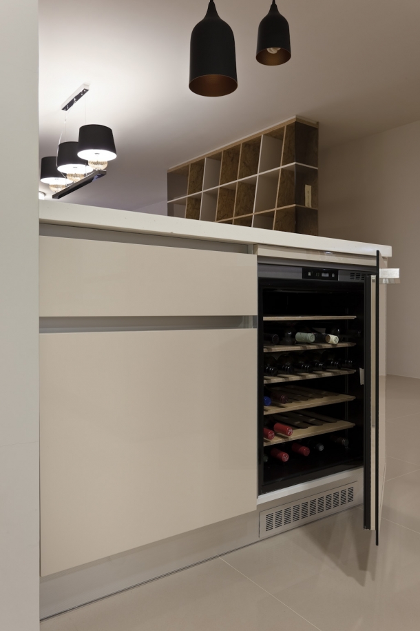 屋主為西餐主廚,對廚房配備格外重視,因此改造過程中,櫥櫃、家電以及動線配置相當講究,希望在家下廚烹煮也能實用方便。像一字型廚具配置3口火爐,前方吧台配置2口電陶爐,滿足不同烹煮需求,然後配置上下廚櫃,提供不同大小櫃體放置各式瓶罐與碗盤,同時舉凡紅酒櫃、微波爐等電器還與櫃體整合,簡化並齊平視野,讓開放式廚房維持簡潔美觀。