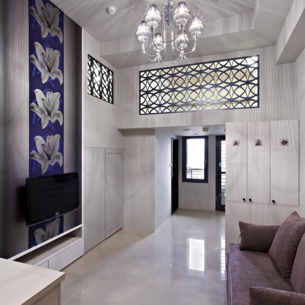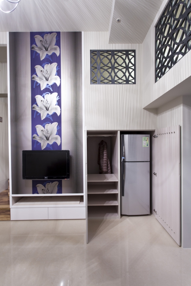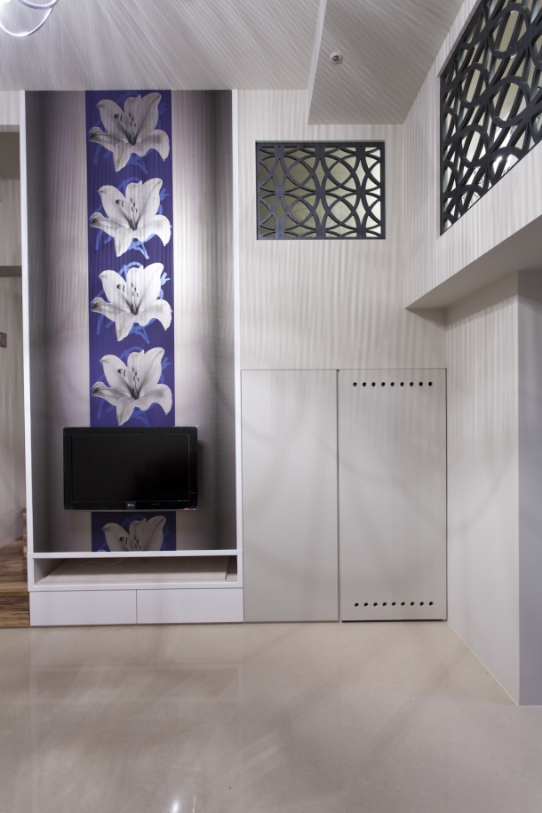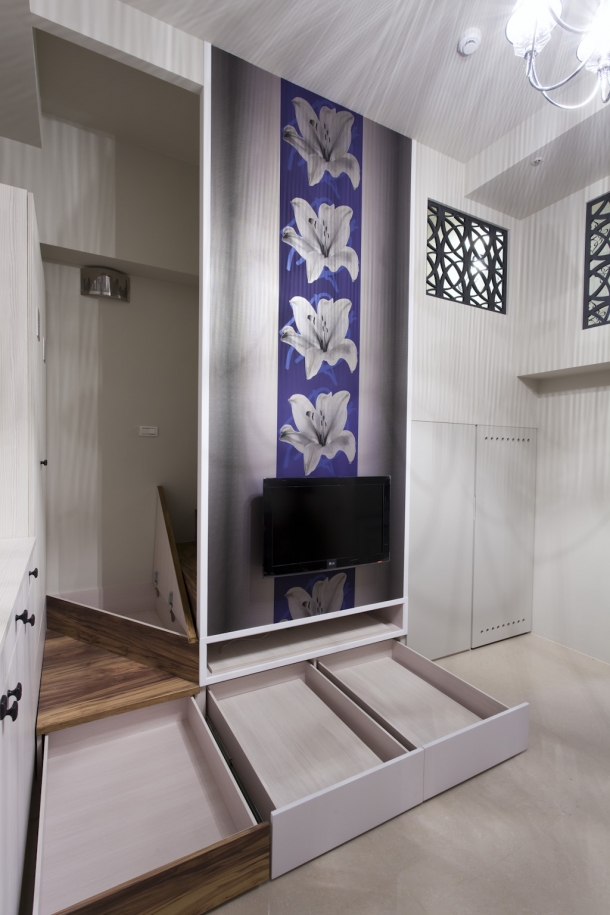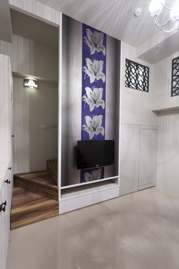 客廳修長的電視牆面,以鮮明的百合花圖案創造視覺焦點,內嵌的視聽櫃巧妙利用牆後踏階下方的空間,並搭配三個並列的大拉抽補充客廳的收納空間,平常關上時則表現乾淨俐落的動線與機能設計。