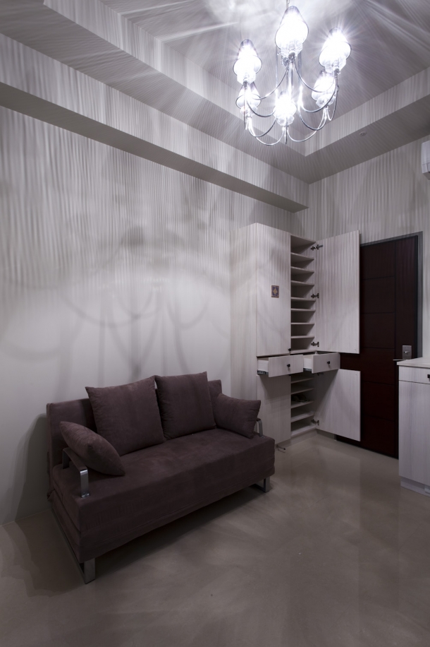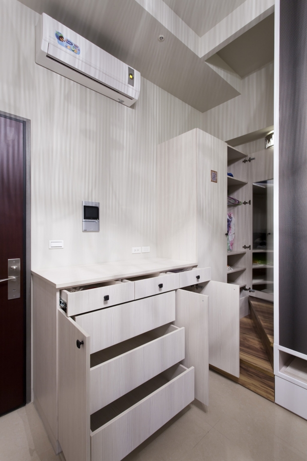 利用客廳沙發旁也就是門後的深度增設大容量鞋櫃,櫃身刻意不作至頂,讓視覺可以向上延伸。