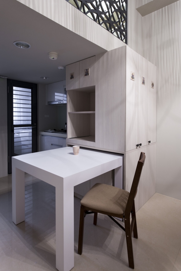 客廳與廚房間規劃精緻的用餐區,最特別的創意是可合身嵌入櫃裡的白色餐桌設計,既輕巧又便利,最重要的就是不佔空間!