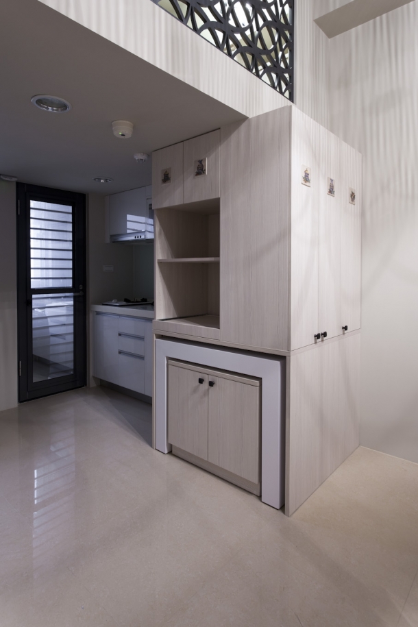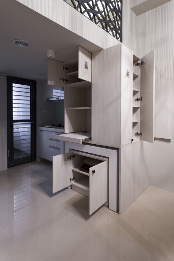 一進門左邊靠牆安排倒L型多功能收納腰櫃,較低的檯面上方可兼作展示與放置小物,高櫃的部份則輔助樓上睡眠區不足的衣物收納機能。