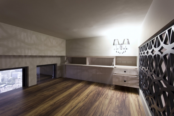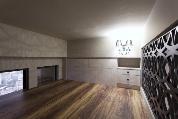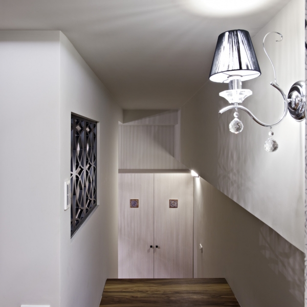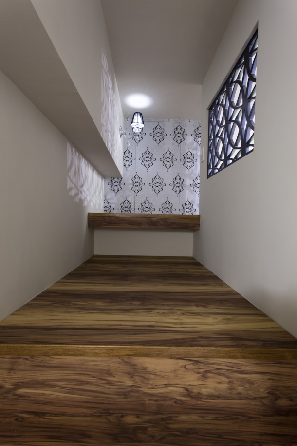 上樓踏階加上漸昇的地坪變化,妥善分配活動中所需的舒適高度,並在牆面鑲嵌鏤空花窗,讓走道內也能感受光線的流動。