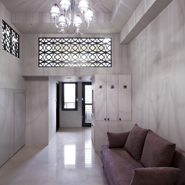 住宅前段的客廳區維持挑高,避免主要活動空間形成壓迫感,並搭配清爽明亮的淺色系放大空間,在二樓夾層的部份也以精緻的鏤空花窗雙向美化隔間,讓戶外的光線可以從各個角落進入室內。
