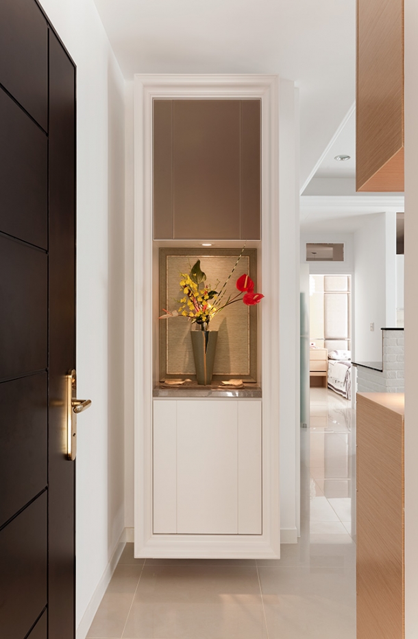 玄關旁安排精美玄關櫃,轉角櫃的部份納入上櫃、燈光展示、小物拉抽與穿鞋椅機能。