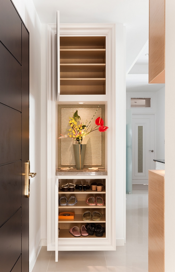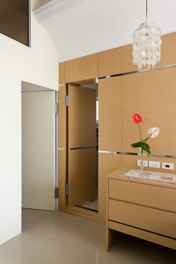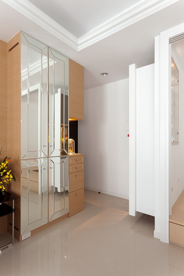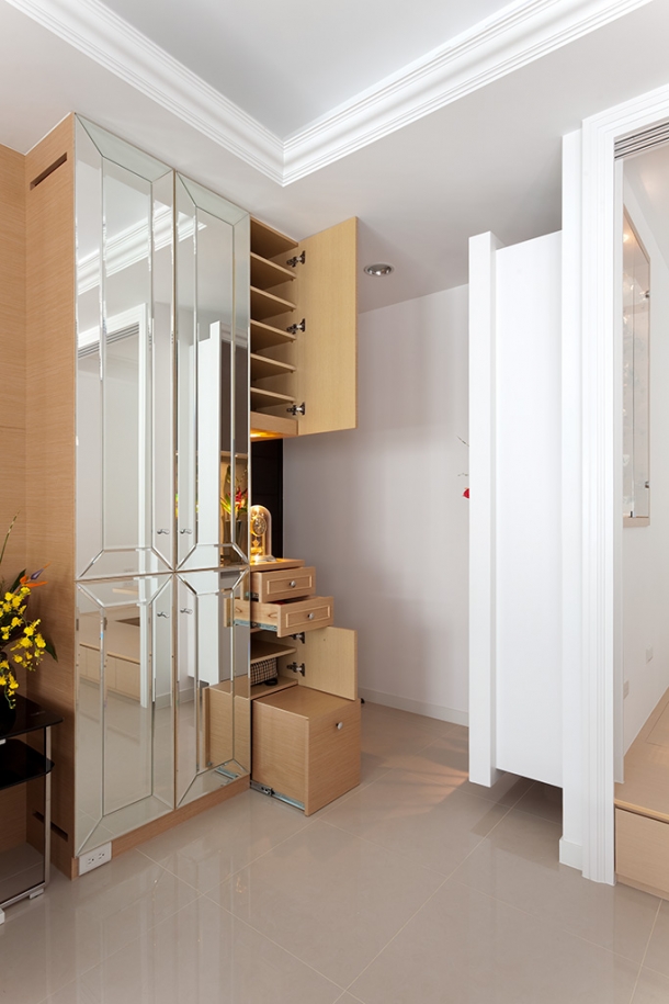 採對稱鏡面導角分割的玄關高櫃,外觀的鏡面拼接線條十分精緻,既能適度反射光影虛化量體,更重要的是提供女主人大量鞋類的儲放空間,我們還特地在櫃側上下端開孔輔助通風。