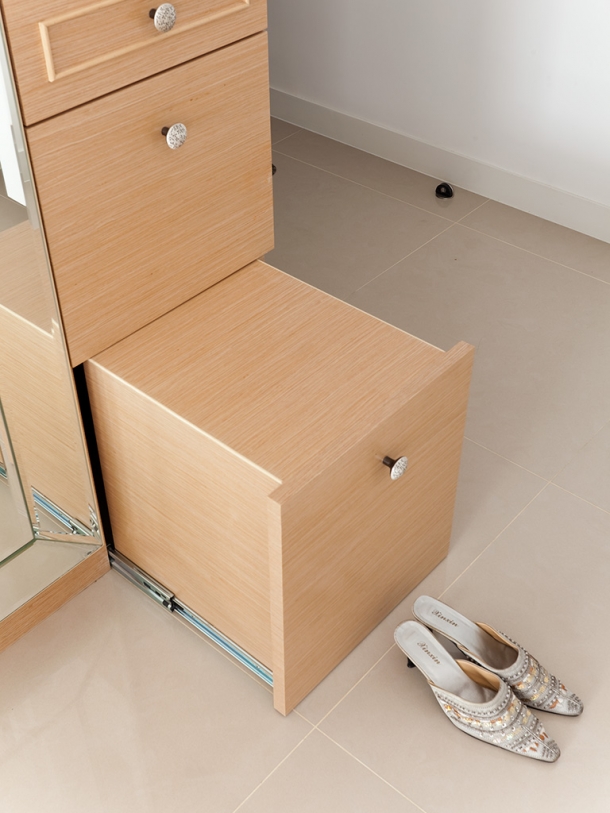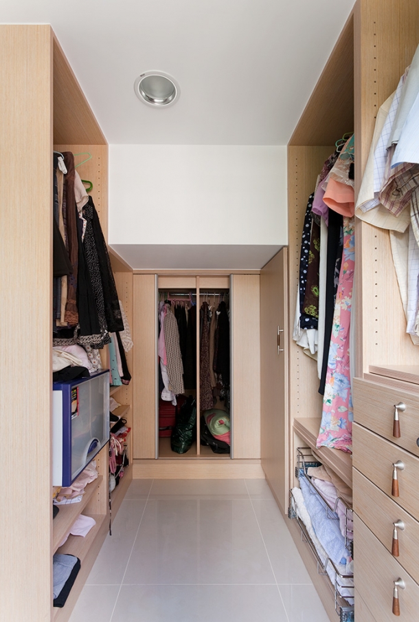 主臥室附設的更衣間設計,簡化的格櫃搭配機能五金,使用上十分便利。