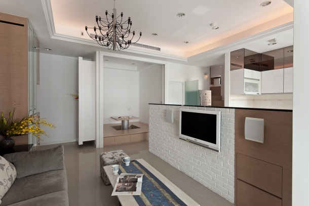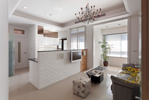 客、餐廳維持挑高3米6的明亮與寬敞,兩者之間並以一座多功能電視半牆來區隔,立面精選質樸白磚修飾,散發美式莊園氣息,必要的視聽機電櫃則集中於主牆左側的木作格櫃內集中管理,以保持空間的乾淨度。