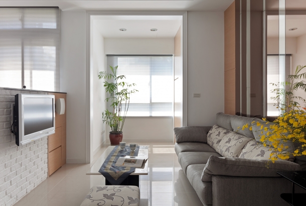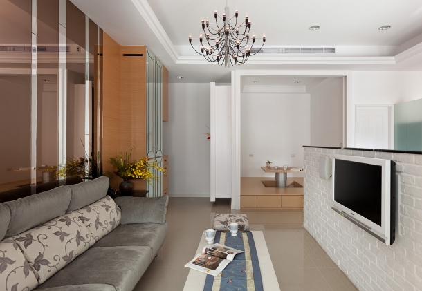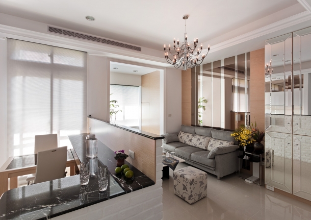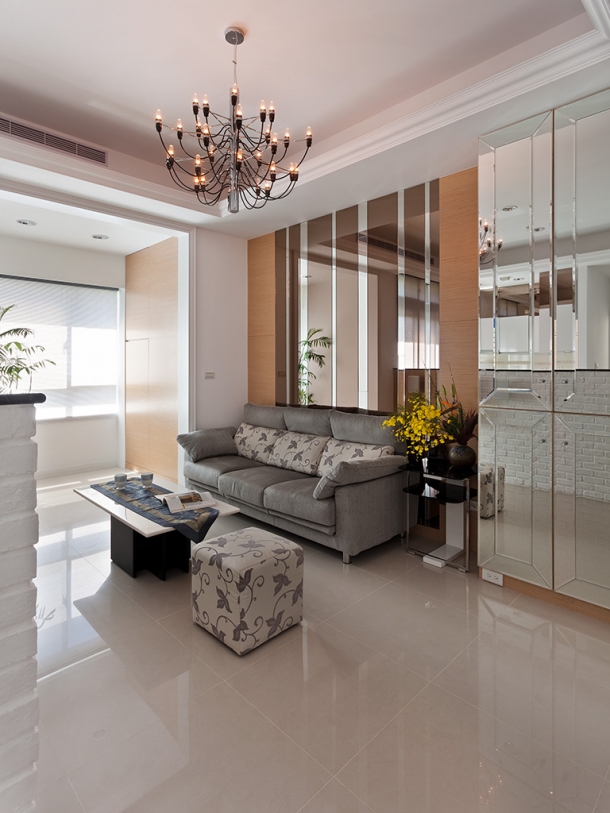 客廳沙發背牆中央以雙色鏡面的拼接,表現迷人光感與輕快線條的變化,兩側對稱木作則有安定、平衡視覺的效果,加上玄關鏡櫃同步反射光影,無形中也能巧妙地將空間放大。