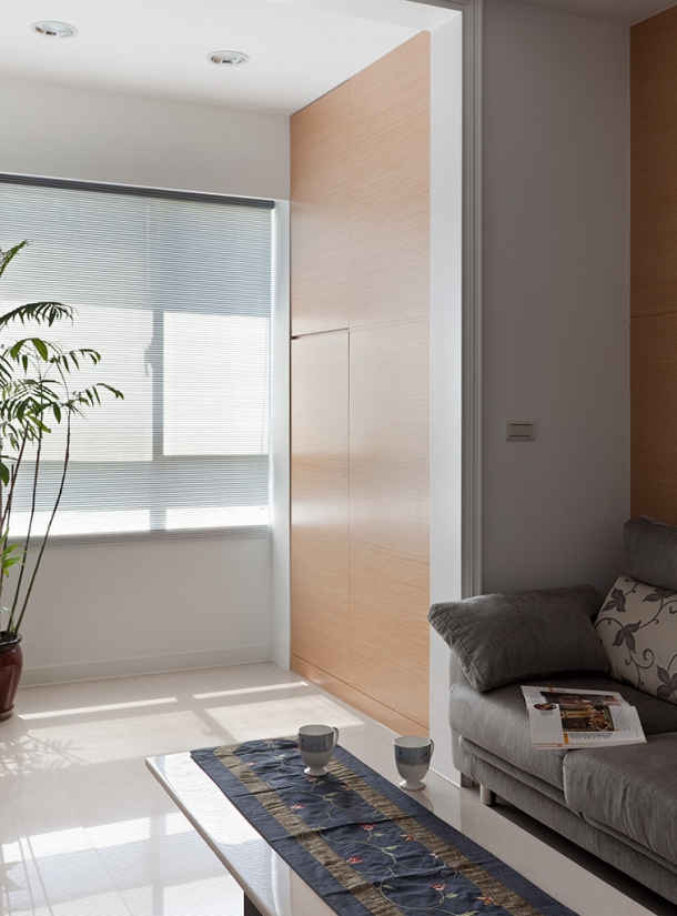 客廳外凸的採光窗右側剛好有一塊畸零空間,我們重新以木料修整立面後,規劃為隱藏式的儲藏間。