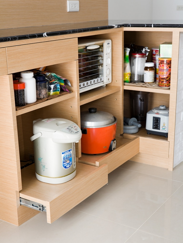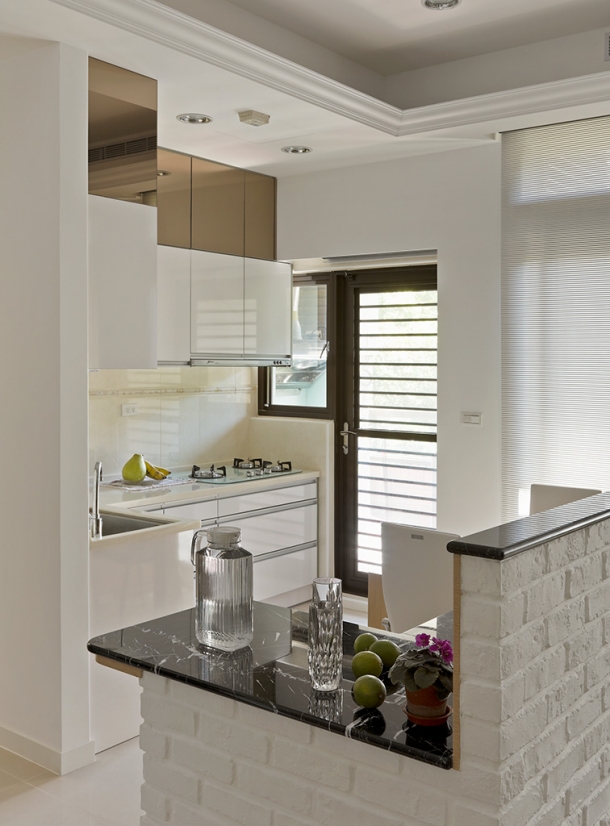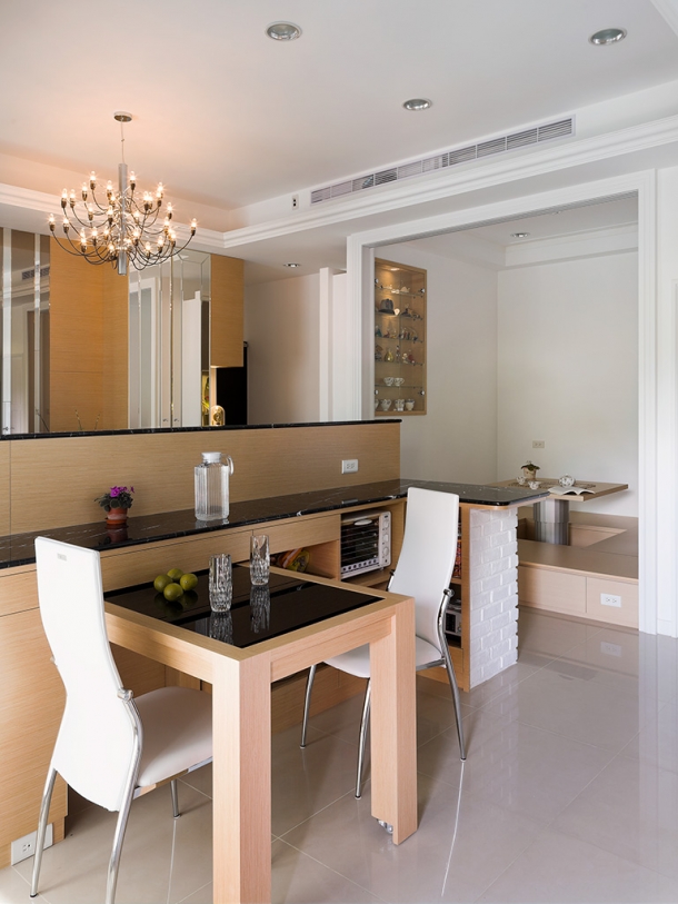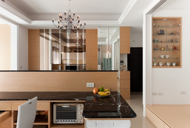 餐廳L型餐檯下方規劃為實用家電櫃,精美的石材檯面手感精緻,格櫃內附的活動拉板便於操作各種生活家電,設想十分周到。 ![]() | ![]() | ![]() |