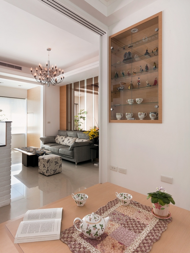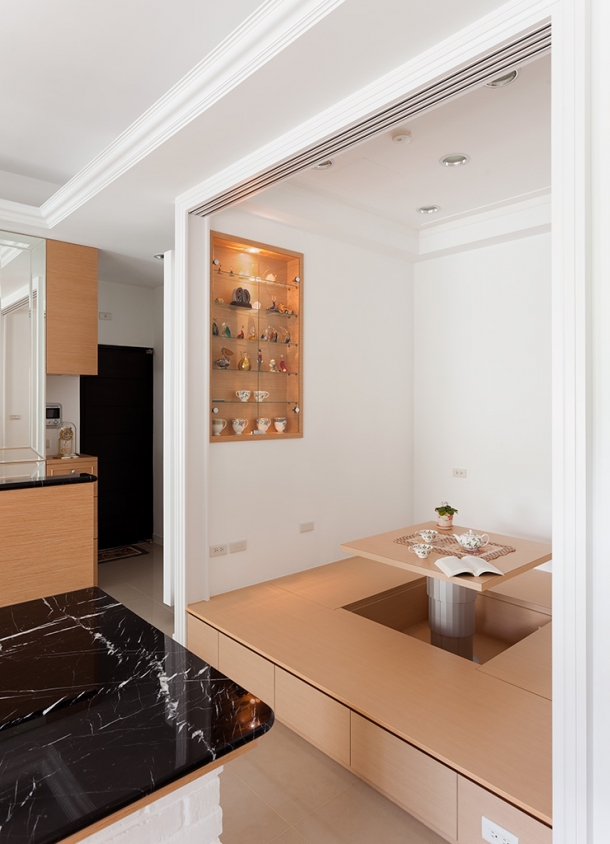 和室牆面點綴嵌入式的精緻杯櫃,展示主人的美麗收藏,架高的地板下方則分別配置拉抽與上掀式收納櫃,滿足大容量的儲物需求。