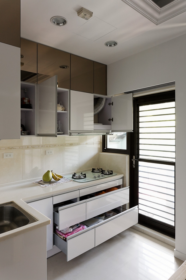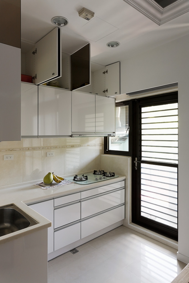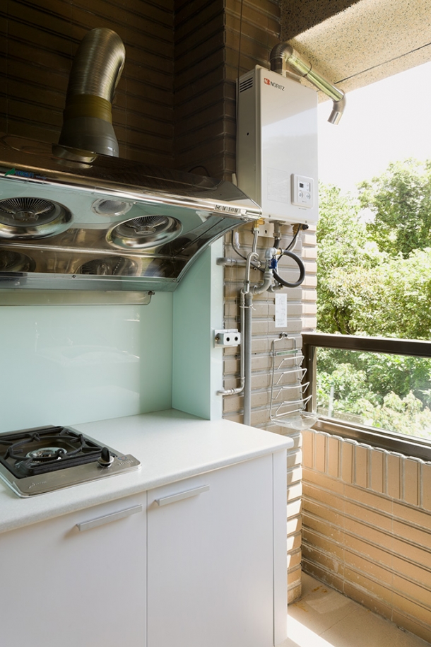 利用工作陽台特製的熱炒廚房,讓小坪數住宅也能擁有豪宅專屬的雙廚機能,堪稱此案的設計特色之一。