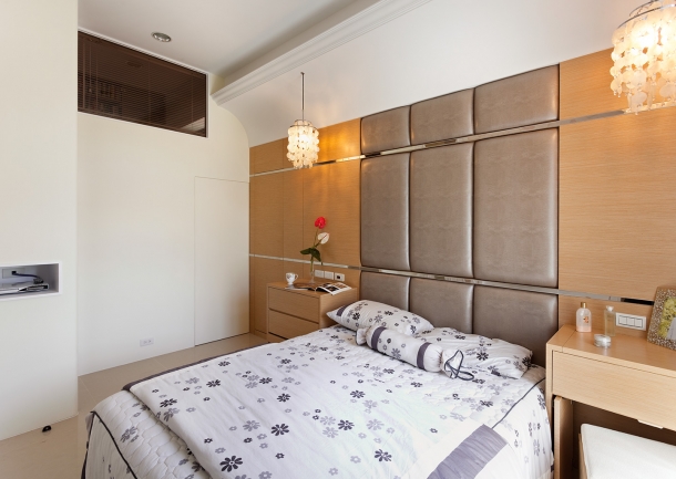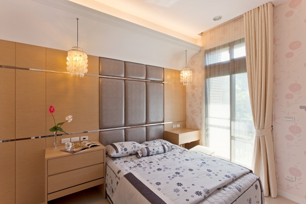 主臥室床頭精緻的皮革繃布造型,鑲嵌上下橫向鏡帶增加立體感,上方的橫樑利用弧度飾板配合間照、浪漫吊燈來化解,空間感美侖美奐。