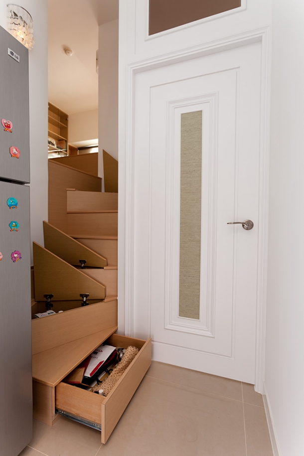 冰箱旁的小巧樓梯通往另一間臥室,每一塊踏階下方都是好用的收納空間。