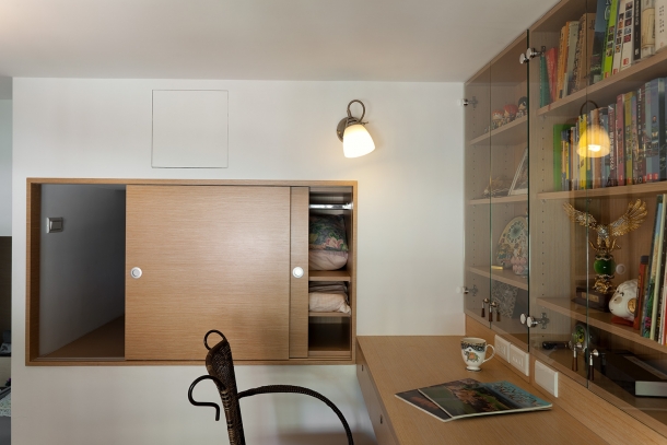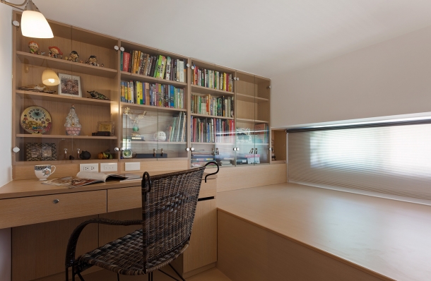 樓上房間的閱讀區旁,嵌入牆面的收納設計是利用客浴的部份高度打造而成,又是一處善用現場高度條件的過人巧思。