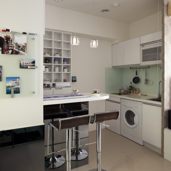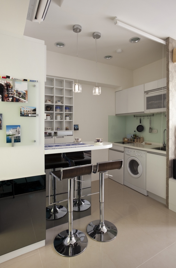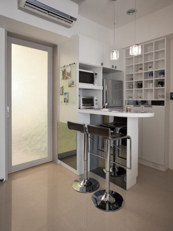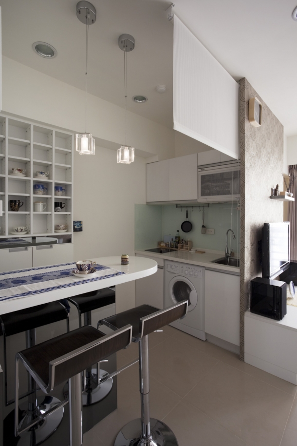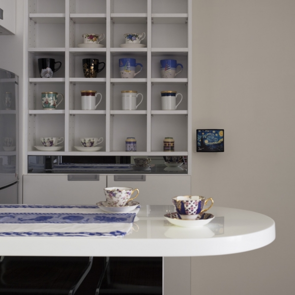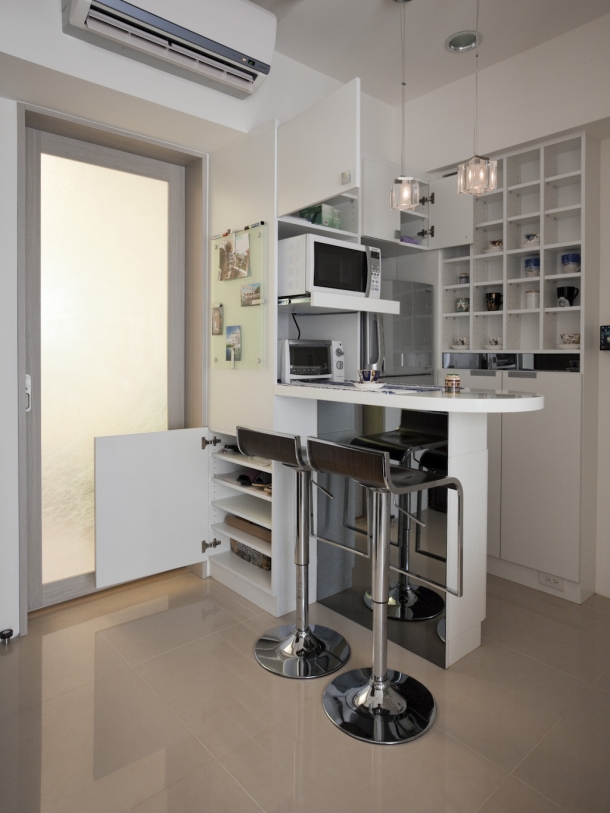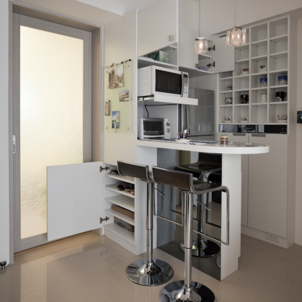 餐廚區以吧臺的形式取代餐桌,電視牆刻意加長修飾廚房一字形工作區,吧臺後方則以別緻的壁掛白色杯櫃作為裝置主題,美麗的各式咖啡杯豐富視覺。