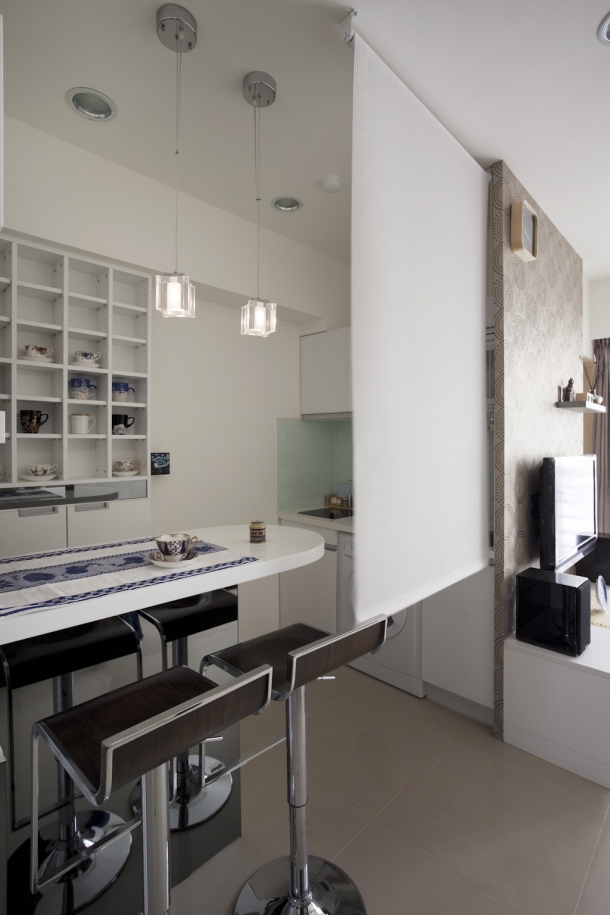 廚房區配置白色捲簾,必要時可以放下輔助界定空間。
