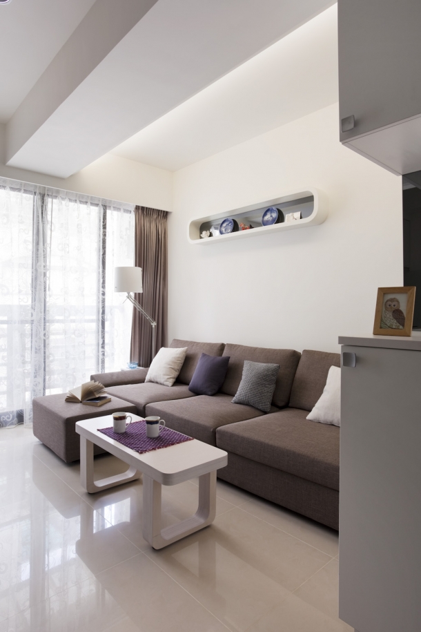 客廳沙發背牆留白處理,好讓空間感更為開闊明亮,牆面點綴兩頭圓弧的立體嵌入式展示櫃,是客廳醒目的視覺焦點。