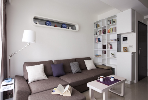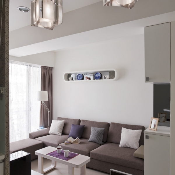 客廳以簡潔、俐落的北歐風格為主題,線條分割的白色格櫃是陳列各種色系單品的最佳舞台,並與牆面可愛的長條弧形展示櫃相互呼應。
