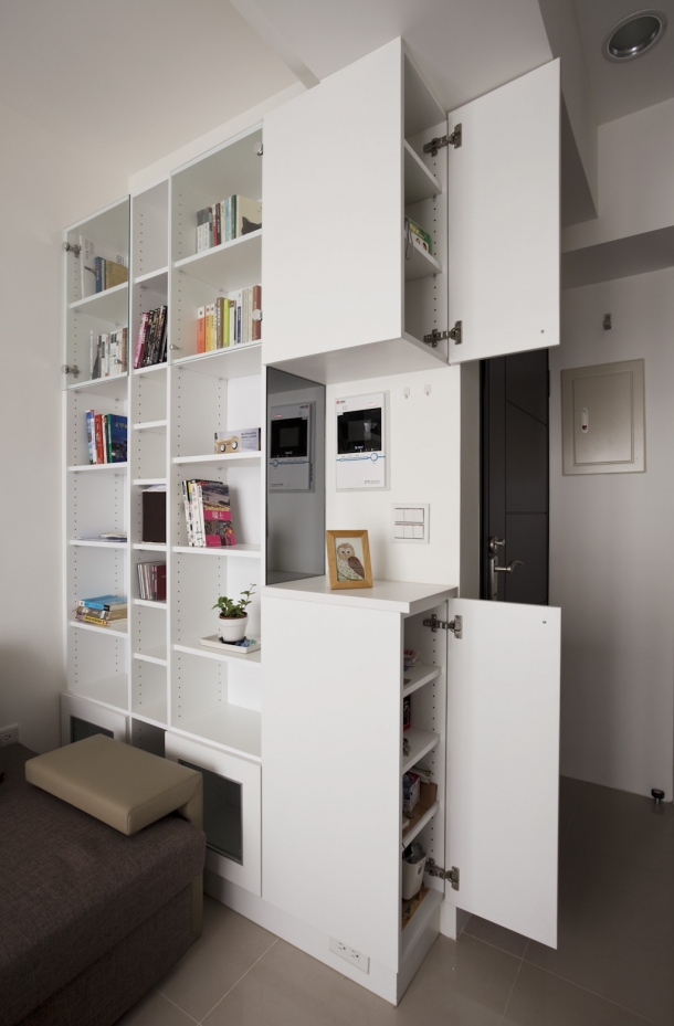 原有的兩扇大門封住其一,並利用現有大門旁的側牆規劃兩面使用的收納兼展示櫃。