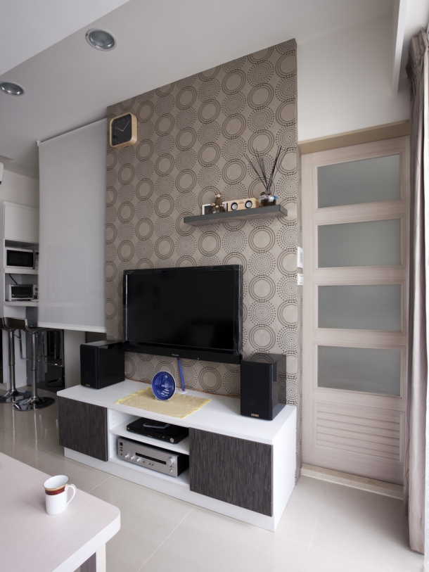 精巧的客廳電視牆以普普風壁紙圖騰美化背景,下方搭配等比例的電視矮櫃,主牆右側為浴室入口。