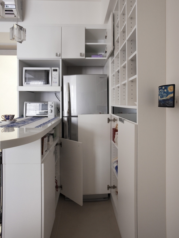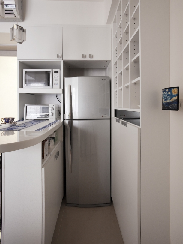利用家電櫃旁的空間與深度,作為安置冰箱的絕佳場地,而吧臺下方與冰箱右邊的收納櫃,都能提供充足的儲物空間。