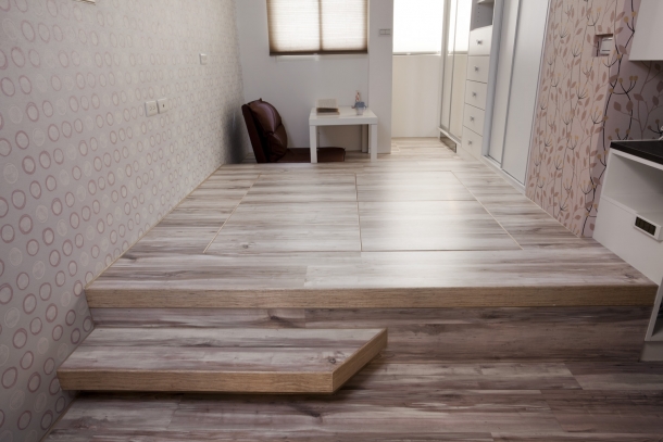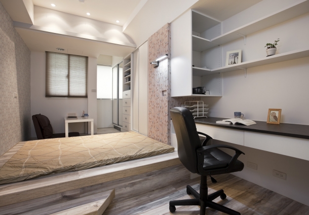 私密空間包括閱讀區、睡眠區與休閒區、衣櫃等機能,利用地板的高低差來界定使用性,地面滿鋪紋理鮮明的木質地板,營造舒適的休憩氣氛。