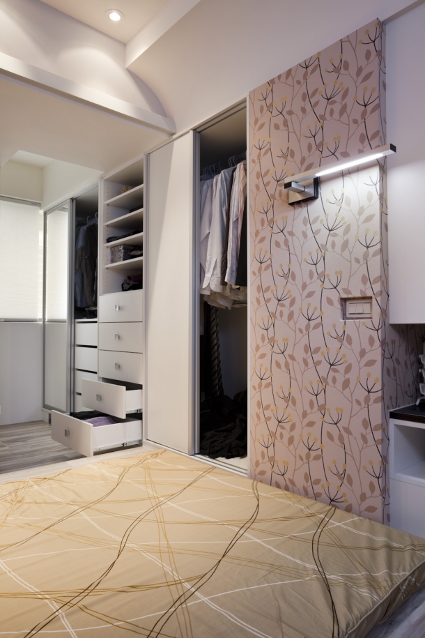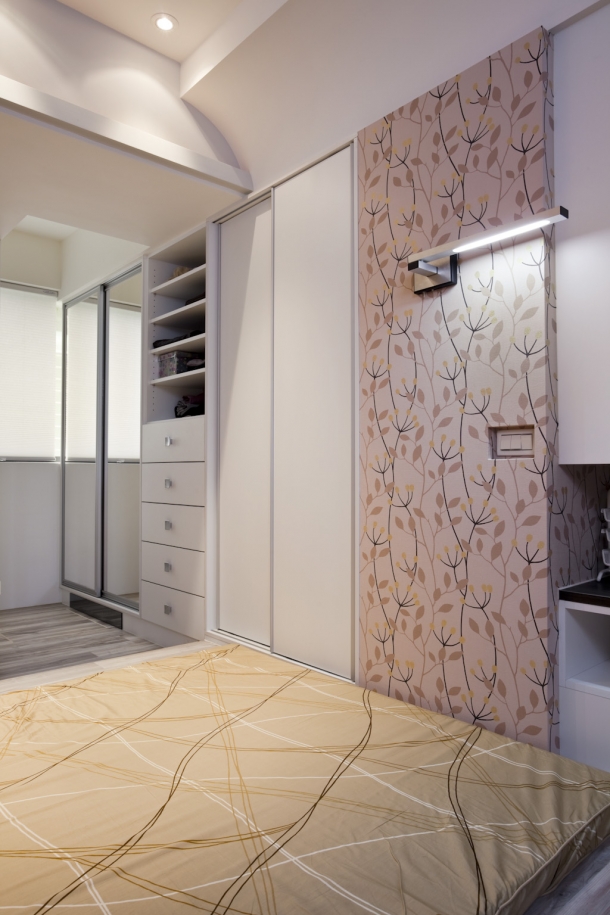睡眠區局部牆面以花葉壁紙修飾,點綴時尚的金屬感造型壁燈,左側是一系列衣櫃與拉抽收納櫃設計。