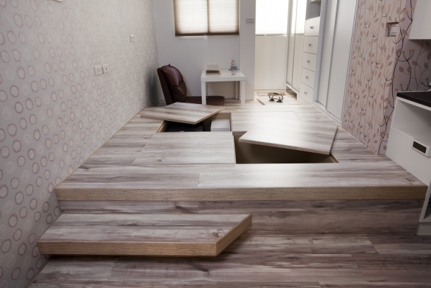 中央架高的睡眠區地板,將軟墊移開後地板可活動掀開,下方是大容量的收納空間。
