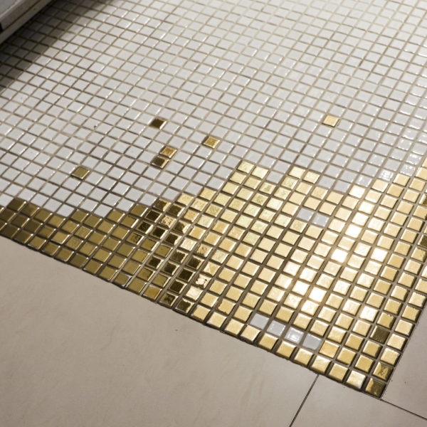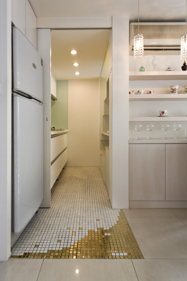 一字形的帶狀廚房以拉門相隔,因為空間不大,特地將冰箱位置挪出來,並以地面別緻的馬賽克拼花圖案象徵串連的空間機能,廚房門邊則是精美杯櫃兼收納櫃。