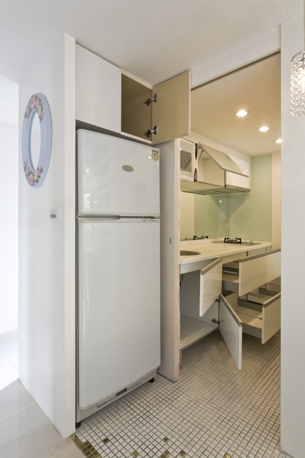 小巧的廚房配置白色系機能傢具,轉角工作牆面仔細貼覆烤漆玻璃,質感明亮且維護不費力,連冰箱上頭的有限空間也規劃為收納區。