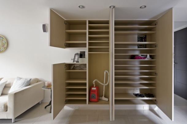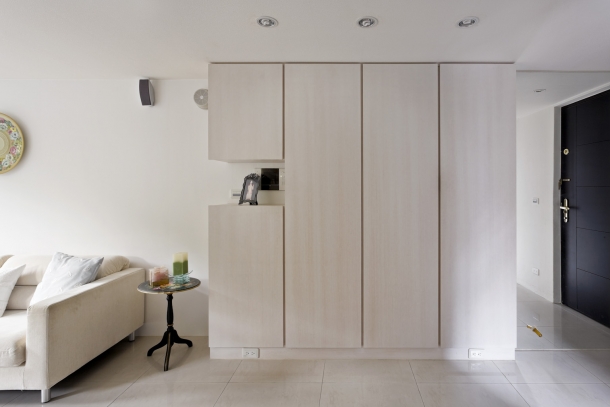 入口大門後方牆面貼覆明鏡,有效放大一進門的視野,四格等比的玄關收納櫃,運用清淺的色彩呈現柔和質地,打開來則是多功能、大容量的儲物空間。