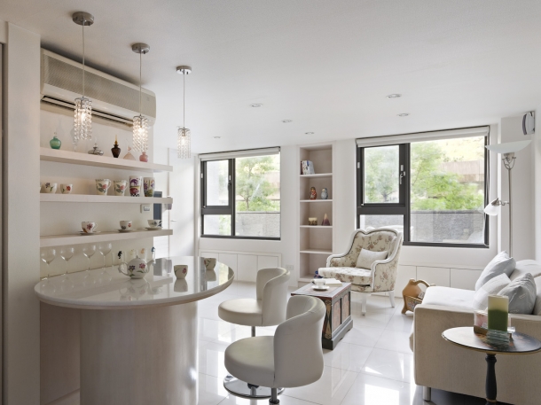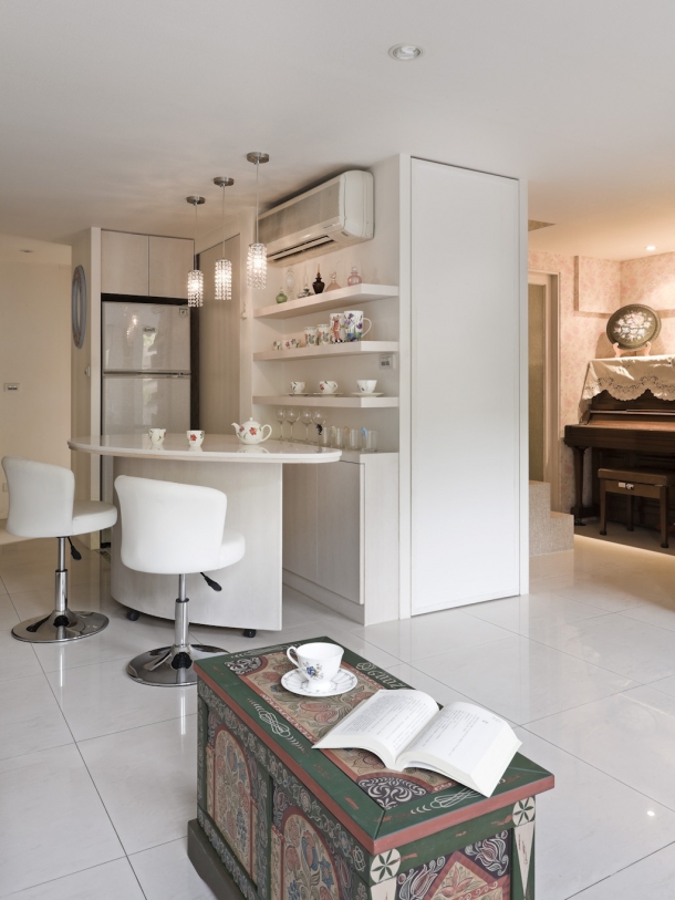 明亮的客、餐廳開放式規劃,特別是底部裝置滾輪的活動式豌豆型餐檯設計,可自由移動變化公共空間的機能形態,兼具彈性與趣味,客廳兩扇對外窗下都利用外凸的空間規劃收納區域,連窗與窗之間的縫隙都成為至中的別緻展示櫃。