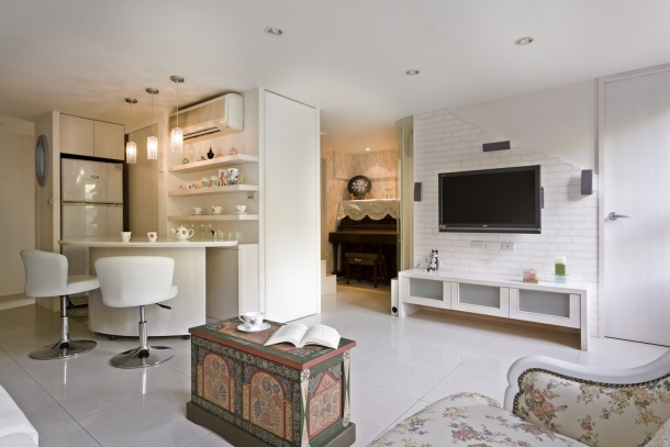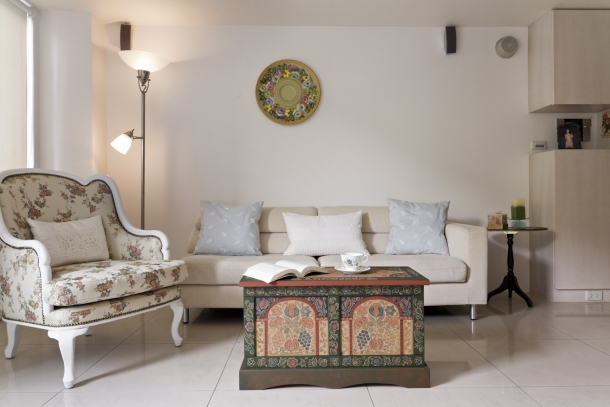 獨一無二的傢具配置手法,特別能彰顯主人的個性品味,一張別具民族風味的彩繪木箱,搭配米色沙發與古典主人椅,讓清爽的客廳瞬間豐富起來。
