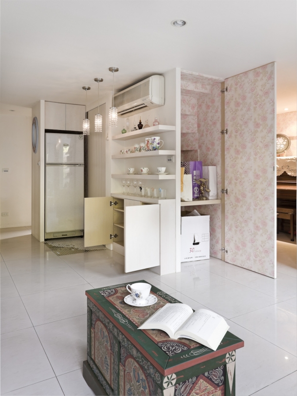 餐檯後方壁掛冷氣的餐櫃,實際上是利用室內梯隔間完成的,面向客廳的暗門打開來,裡面是善用梯下畸零的儲藏室,我們還挑選夢幻的玫瑰圖案壁紙加以美化,展現施作細節的講究。
